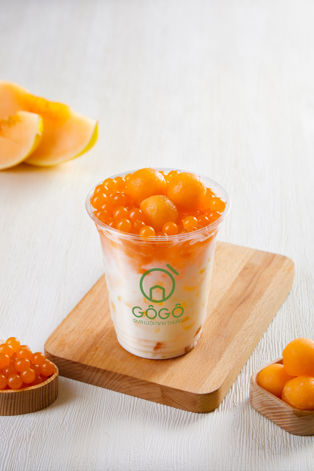 Topping: 3 viên dưa lưới tươi và 20gr thạch thuỷ tinh dưa lưới.